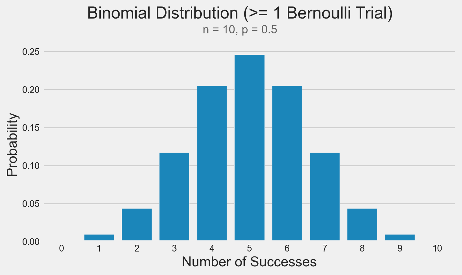 Since it’s a fair coin, with a 50% chance of success, we’re most likely to see 5 out of 10 successes.